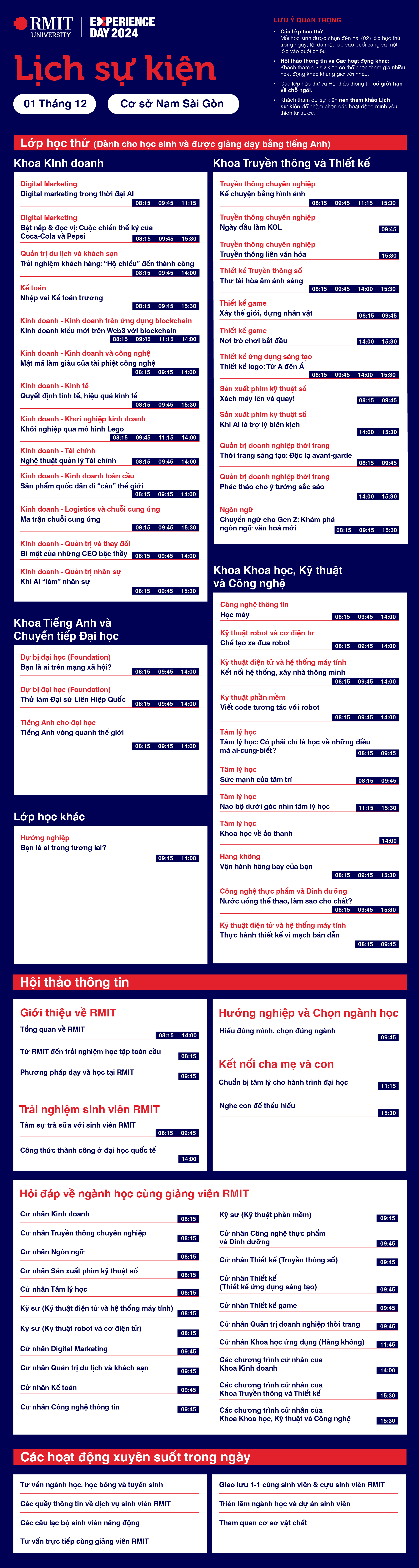 - Tham khảo trước các hoạt động bạn yêu thích và đến RMIT đúng giờ để giữ chỗ cho các hoạt động này.